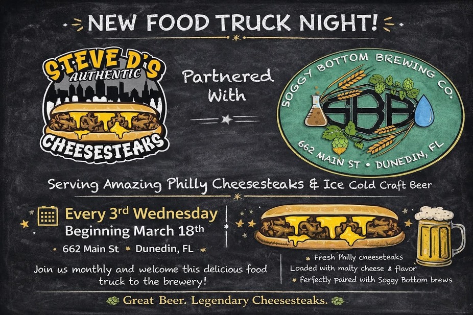 We’re excited to welcome Steve D’s Authentic Philly Cheesesteaks to Soggy Bottom Brewery for a delicious monthly food truck night! Join us every 3rd Wednesday as Steve D’s serves up their famous authentic Philly cheesesteaks — loaded with melty cheese, perfectly seasoned steak, and incredible flavor. 🎣 Make a night of it! This event pairs perfectly with our Fly Casting Night, happening the same evening. Grab a beer, learn something new with fly casting, and then reward yourself with an incredible cheesesteak — the ultimate Soggy Bottom experience! 📅 Date: April 15th ⏰ Time: 5-9pm 📍 Location: Soggy Bottom Brewery 662 Main St, Dunedin, FL Bring your friends, grab a cold beer, and enjoy one of the best cheesesteaks around. This is quickly becoming a monthly tradition you won’t want to miss! 🍺 Great Beer 🧀 Legendary Cheesesteaks 🎣 Fly Casting Fun 🤝 Great Community See you at the brewery!