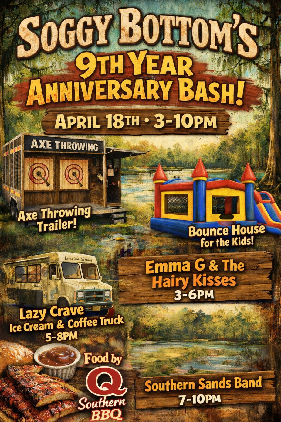 We’re turning NINE years old and we’re throwing a Parking Lot Bash to celebrate with all of you who made it possible! Join us for a full afternoon and evening of live music, amazing brews, incredible BBQ, and family fun as we celebrate another year of great beer and great community at Soggy Bottom! 🎶 LIVE MUSIC 🔥 Emma G & Hairy Kisses | 3PM – 6PM 🔥 Southern Sands Band | 7PM – 10PM 🍺 Beer Trailer pouring your favorite Soggy Bottom brews all day! 🍨 Ice Cream for a sweet treat! 🍖 Q Southern BBQ serving up incredible BBQ eats! 🎈 Bounce House for the Kids – family friendly fun! ✨ More activities and surprises coming soon! This is our biggest celebration of the year, and we want all of our amazing regulars, friends, and first-timers there to celebrate with us. Bring your friends, bring the family, grab a beer, and let’s make our 9th anniversary unforgettable! 🍻 Cheers to 9 amazing years, Dunedin! #SoggyBottomBrewery #SoggyBottomAnniversary #DunedinFL #DrinkLocalFL #LiveMusicDunedin #CraftBeerCommunity #ParkingLotParty #CheersTo9Years 🍻